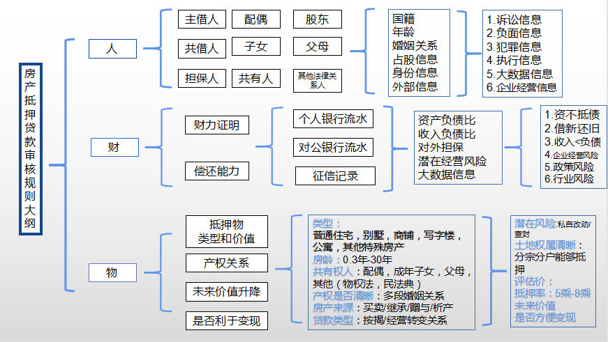 人包括:主借人,共同借款人、贷款担保人、相关另一半、子女、产权共有人、公司股东、父母、其他法律近亲。审批人有:国家贷款、年龄、夫妻关系、持股信息内容、身份证信息、外部信息(审批面包括:1。诉讼信息2负面信息 3.犯罪信息 4.执行信息 5.大数据 6.企业经营信息内容)以上所有审批点均为一票否决制度,即如果其中一人、某一点、某一原因不符合银行贷款审批标准,可以直接拒绝。